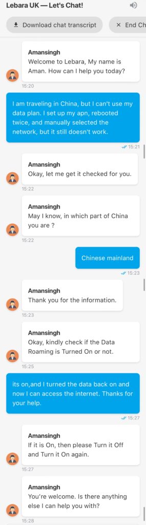 如果还是不能上网,就需要找客服处理了,需要在英国工作日时间段内才可联系到客服,下载lebara app,通过 *#100#(进入拨号,输入上面一串字符即可)获取手机号,登陆后,点击app右下角的help,划到页面最下面,点击start chat。以下为在大陆漫游激活,联系客服重置漫游的例子: