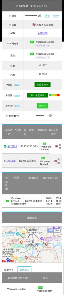 虽然lebara这个运营商是个虚拟运营商,但uk区的lebara提供的欧洲及其他地区的流量套餐可以算得上量大管饱了,1-2英镑每月就有30GB的流量。所用的网络为英国沃达丰提供(vodafone UK),据ping0.cc查询漫游ip如下图:
